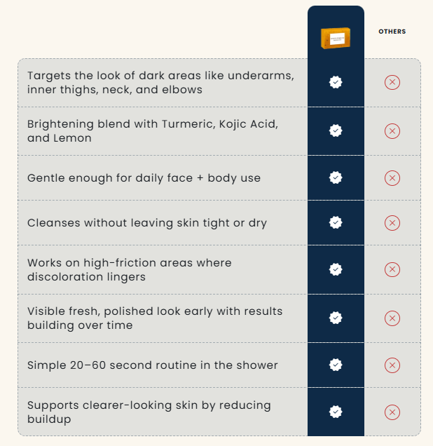 Gentle brightening ingredients lke turmeric and kojic acid help fade the look of dark spots, caim iritation and keep your routine quick and easy-just lather, rinse and go.
